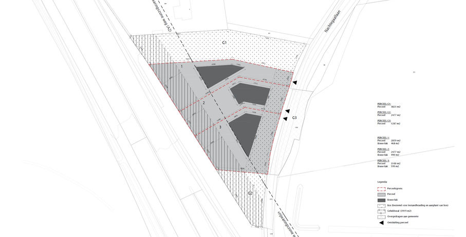 Kavel van circa 4.440 m² waarvan circa 400 m² grondwal/talud te integreren in de achtertuin. Bouwvlak van 599 m², max. inhoud 1.000 m³.